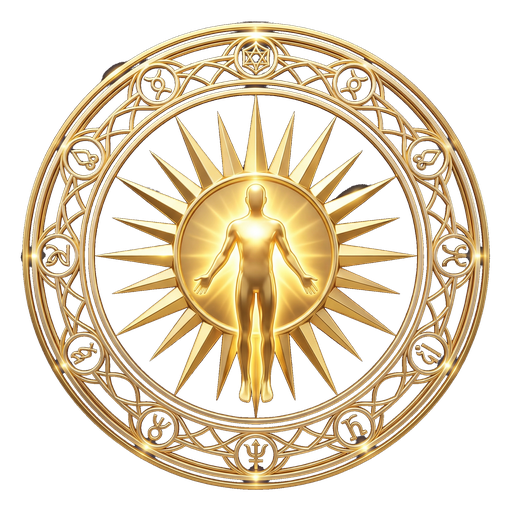 Der leuchtende Mensch im Zentrum steht für das Wesen, das du wirklich bist – ein Lichtgeschöpf aus Gottes Hand, das weit mehr ist als Fleisch und Knochen.